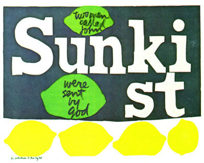 By the 1960s, she was using popular culture (such as song lyrics and advertising slogans) as raw material for her meaning-filled bursts of text and color. Corita’s cries for peace in the era of Vietnam were not always welcome. In 1965 her "Peace on Earth" Christmas exhibit in IBM’s New York show room was seen as too subversive and Corita had to amend it. However, her work continued to be an outlet for her activism—in Corita's words: