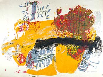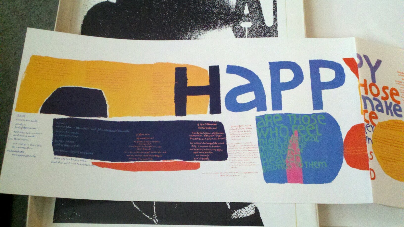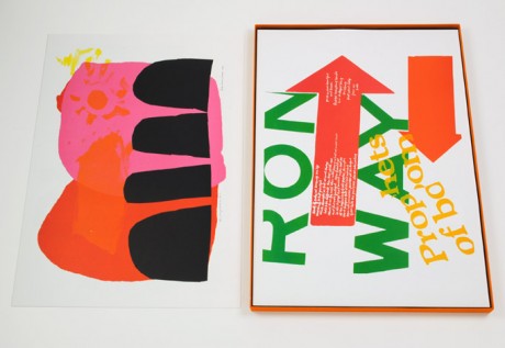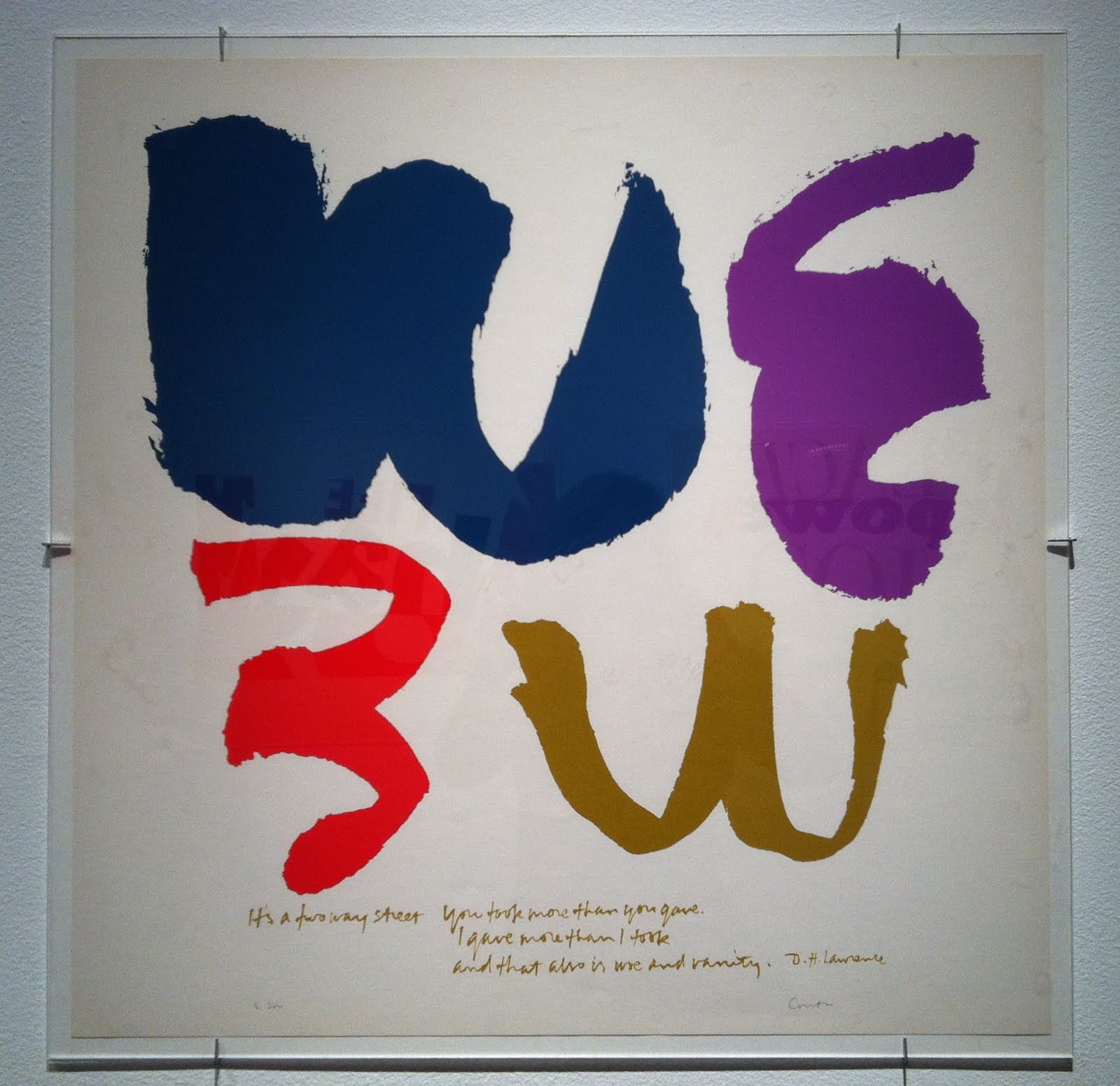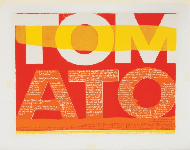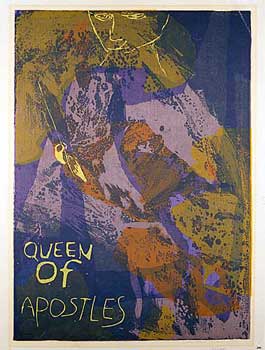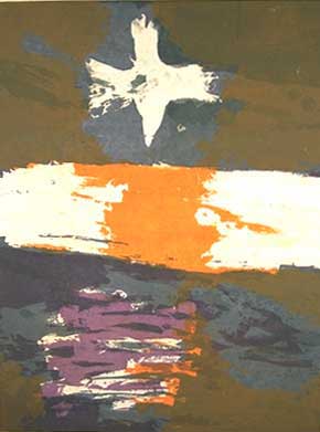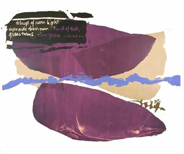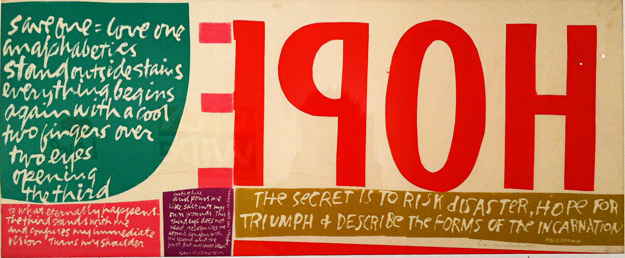 Corita’s chronic insomnia no doubt made some of this possible, but it was often accompanied by a bleak depression. In 1968 Corita decided to devote herself entirely to making art. She left the Order and Los Angeles, and moved to Boston’s Back Bay. She made numerous commissioned works (Westinghouse Group W ads, book covers and murals) and continued to create her own serigraphs (over 400) in the next 18 years. Still using exuberant splashes of color, the tone of her work became more generally spiritual and introspective.